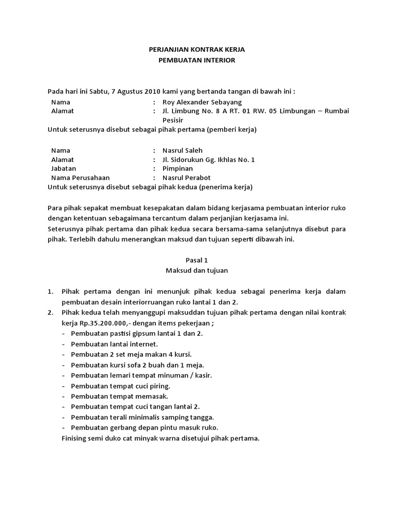 Saat masuk bekerja di sebuah perusahaan pertama kali sebelumnya pasti anda menandatangani kontrak kerja. Surat perjanjian kontrak kerja bersifat mengikat dan bisa dijadikan sebagai bukti bahwa kedua belah pihak telah sepakat membangun kerja sama sesuai dengan ketentuan yang telah dijabarkan pada surat. Yang akan kita angkat menjadi topik pembahasan kita kali ini adalah mengenai contoh kontrak kerja yang baik dan benar. Contoh surat kontrak kerja interior have a graphic from the other.contoh surat kontrak kerja interior in addition, it will include a picture of a kind that could be seen in the gallery of contoh surat kontrak kerja interior. 3 kontrak kerja konstruksi adalah dokumen/produk hukum.